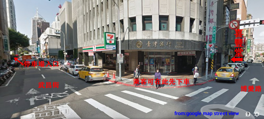 | 汽車 | 若停在中山堂(由武昌街進入地下停車場),下車後往從武昌街出口上來,往右沿武昌街走到路口(有7-11超商和台銀),再左轉過紅綠燈,再往前走到88號,或停到重慶南路與漢口街交叉口的停車場【華南銀行正門旁邊入口進入地下停車場停車】。 |